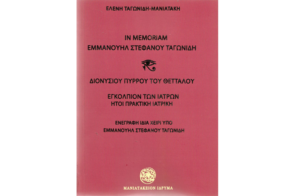Και στην εκδήλωση αυτή, που πραγματοποιήθηκε σε μια κατάμεστη αίθουσα, παρουσιάστηκε το βιβλίο «In Memoriam Εμμανουήλ Στεφάνου Ταγωνίδη-Διονυσίου Πύρρου του Θετταλού Εγκόλπιον των Ιατρών ήτοι Πρακτική Ιατρική».
