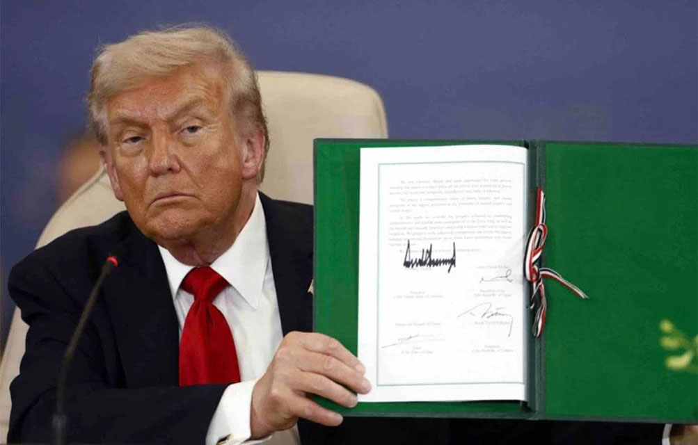 Στη Σύνοδο για τη Γάζα στο Σαρμ ελ Σέιχ της Αιγύπτου, ο Τραμπ υπέγραψε, μαζί με τους ηγέτες της Αιγύπτου, του Κατάρ και της Τουρκίας, τη διακήρυξη «Ειρήνη 2025», με στόχο την παγίωση της κατάπαυσης του πυρός και την έναρξη μιας νέας περιόδου σταθερότητας στη Γάζα.