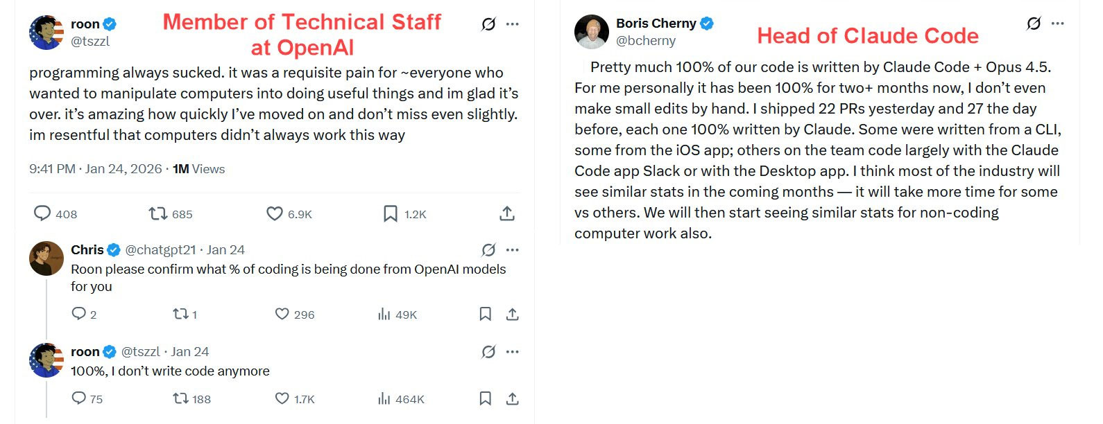 Το Claude Code (και ανταγωνιστές όπως το Codex της OpenAI) τυγχάνουν πλέον της εμπιστοσύνης των κορυφαίων προγραμματιστών στον κόσμο: εκείνων της Anthropic και της OpenAI, οι οποίοι τα χρησιμοποιούν για να γράψουν το 100% του κώδικά τους. Στην περίπτωση του Claude Code, γράφει την ίδια του τη βάση κώδικα. Αυτό είναι ένα παράξενο φαινόμενο. Το εργαλείο που φτιάχνει τον εαυτό του — ίσως ακόμη και η εφεύρεση που αποτελεί, η ίδια, μέθοδο εφεύρεσης.